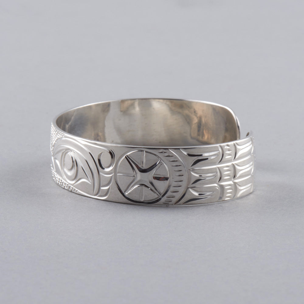 Rings are available to order in various sizes. Please contact the gallery directly. Indigenous artwork on the Pacific Northwest Coast often incorporates figures and animals that are related to crest symbols. Crests have been passed down through families and have varying meanings depending on the context and association with a nation, clan, or family. The figures depicted in contemporary Northwest Coast Indigenous artwork also have varying meanings but there are some common characteristics fro...