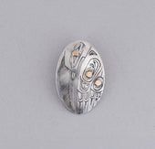 Hummingbird is a popular figure in Northwest Coast artwork, especially in jewelry. Generally, Hummingbird has associations with joy, beauty, and good luck. A legend from the Kwakwaka'wakw says that Dzunuk'wa (guardian of the mountains and Wild Woman of the Woods) loved this little bird so much that she let him nest in her hair. In return, the Hummingbird looked like jewelry pinned in her hair. Of all the birds, Hummingbird is the most talented flyer as it can hover in one place, fly sideways, backwards, and forwards. It is agile and adaptable, and some say can teach us how to move forward. Hummingbird is usually depicted with a small round head and a long beak with a sharp point. Flowers are often included in a design with Hummingbird.