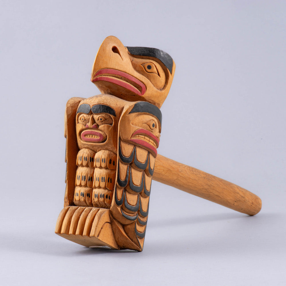 Pole says "Alert Bay 1959" on the backside and "Alert Bay 1958" on the bottom of the base. This piece was likely collected in Alert Bay, but is distinctly Salish in style. It's supposed that the piece was purchased from one of a few curio-tourist style shops, many of which carried works from artists of varying Nations along the coast.