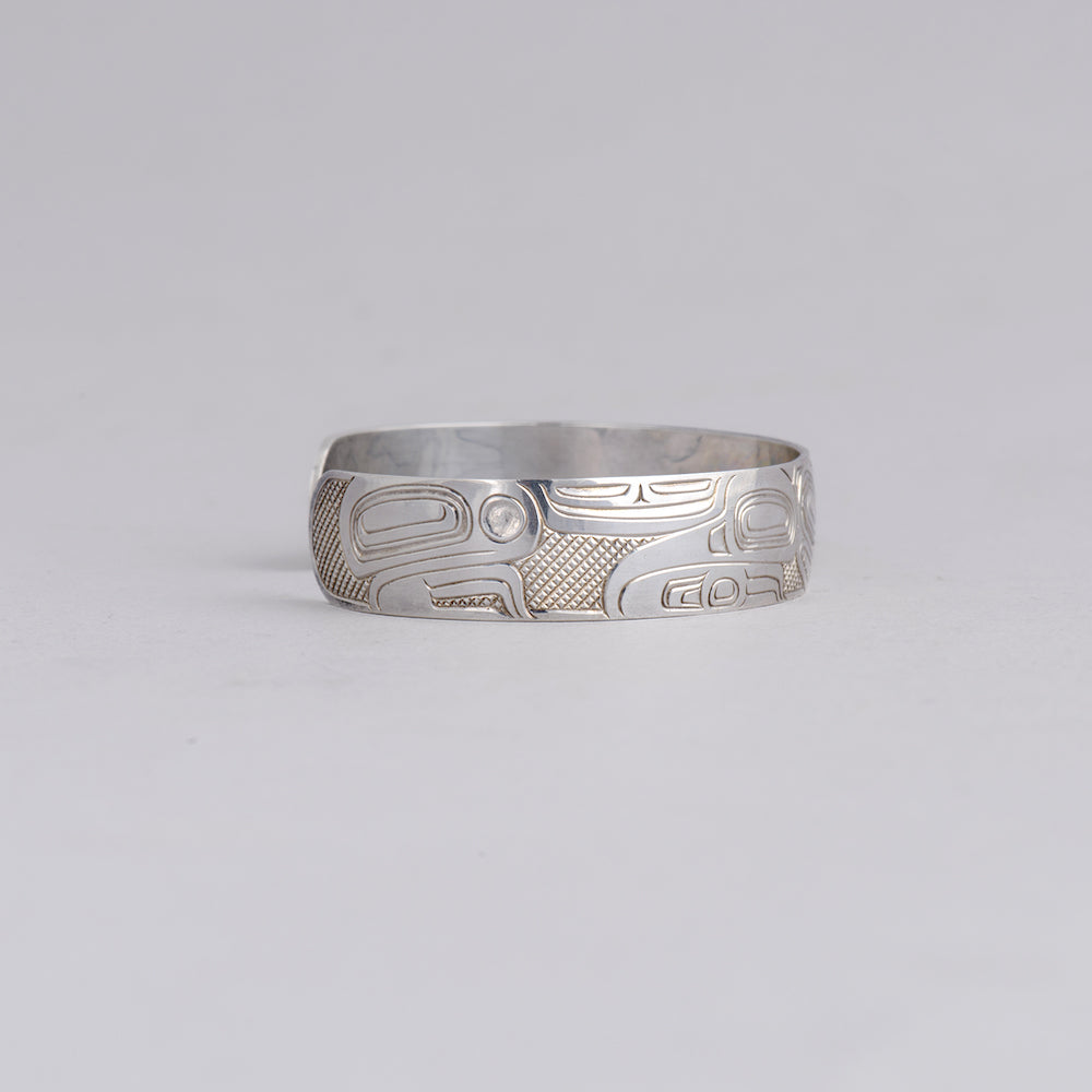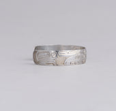 Bear is one of the most prevalent figures in Northwest Coast art and oral tradition. Bear is often considered to be a close relation to humankind and a link between the human and non-human realms due to physical characteristics such as appearance and expression, as well as anthropomorphic behaviours like nurturing young and standing on hind legs. Associated with strength and fierceness, Bears have been depicted as guardians and protectors of human heroes. Bear is identified by a wide mouth with prominent teeth, a short round snout with large nostrils, and clawed feet.