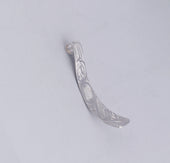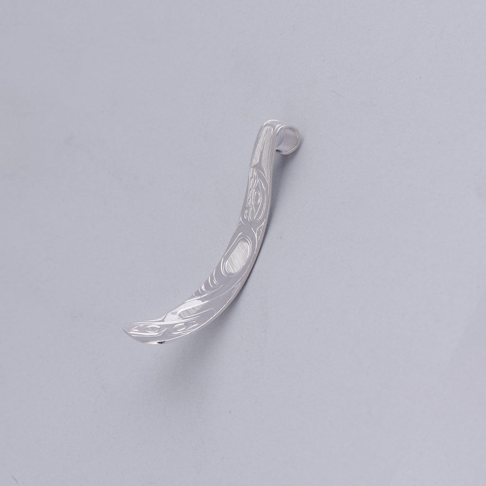 Killer Whale is a common crest and being among many groups of the Northwest Coast, and one of the most prevalent depictions in the artwork. In some Haida oral traditions, Raven-Finned Killer Whale is a whale-chief and characterized by a Raven-headed dorsal fin. There are also Haida depictions of two-, three-, and even five-finned Killer Whales. It has been suggested that these supernatural figures may have originated from sightings of whale pods surfacing, with multiple dorsal fins visible above the water. Killer Whale’s familial bonds and skillfulness in teamwork can oftentimes lead to associations with communication, family, unity, and travel. Killer Whale is generally identified by a large ovoid eye, blowhole, dorsal fin, and tail flukes.