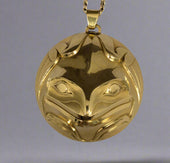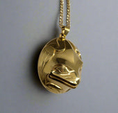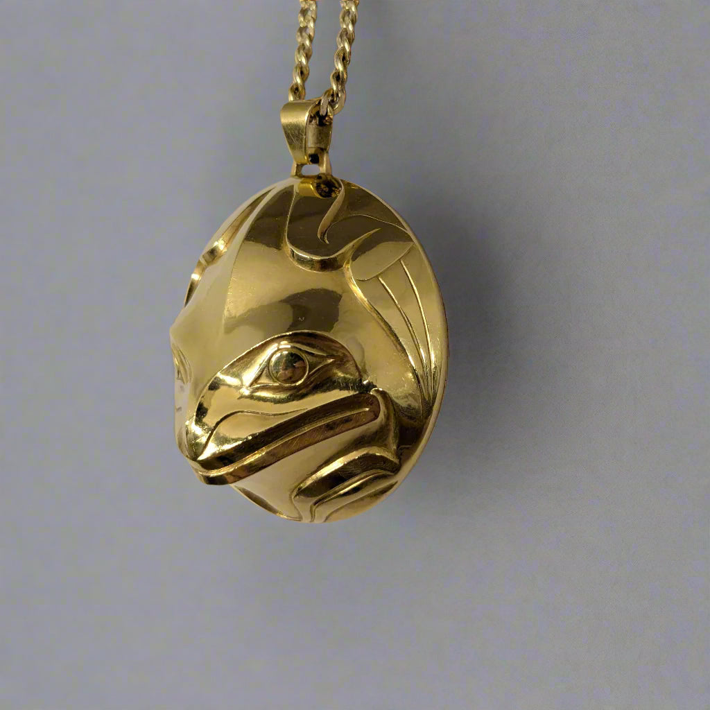 Frog is a creature of great importance on the Northwest Coast. Frogs are social and vocal creatures and are typically seen as the communicators of the animal world. They often symbolize communication and represent the voice of the people. Frog is also associated with versatility as it lives in both water and land. In Northwest Coast artwork, Frog is sometimes depicted with its tongue going into the mouth of another figure as a visual reference for sharing knowledge. Frog is generally given large eyes, prominent lips with a projecting tongue and webbed feet.