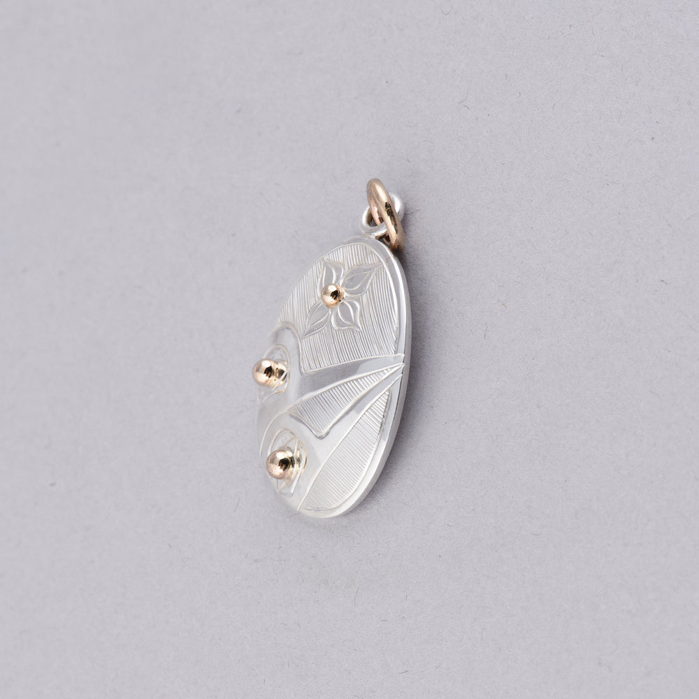 Hummingbird is a popular figure in Northwest Coast artwork, especially in jewelry. Generally, Hummingbird has associations with joy, beauty, and good luck. A legend from the Kwakwaka'wakw says that Dzunuk'wa (guardian of the mountains and Wild Woman of the Woods) loved this little bird so much that she let him nest in her hair. In return, the Hummingbird looked like jewelry pinned in her hair. Of all the birds, Hummingbird is the most talented flyer as it can hover in one place, fly sideways, backwards, and forwards. It is agile and adaptable, and some say can teach us how to move forward. Hummingbird is usually depicted with a small round head and a long beak with a sharp point. Flowers are often included in a design with Hummingbird.