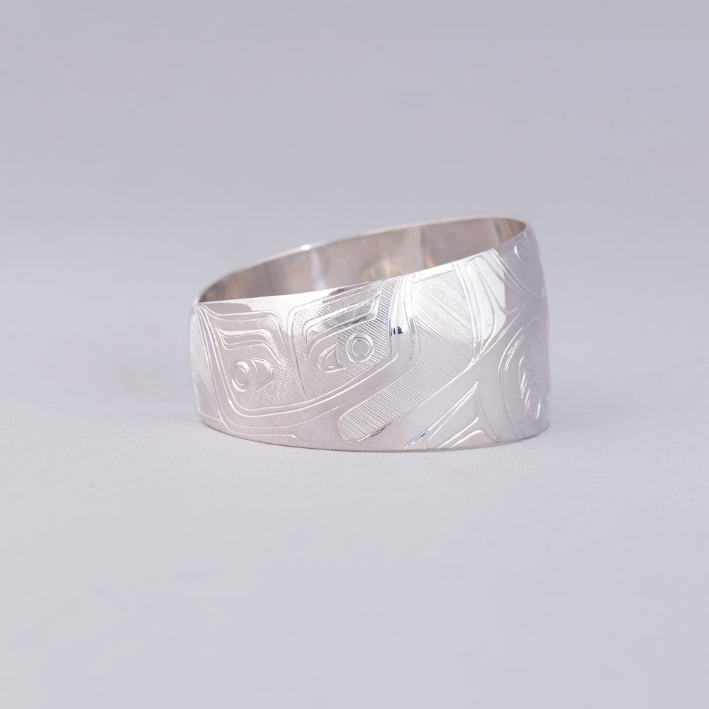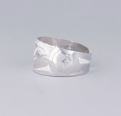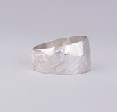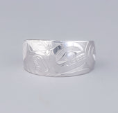 Killer Whale is a common crest and being among many groups of the Northwest Coast, and one of the most prevalent depictions in the artwork. In some Haida oral traditions, Raven-Finned Killer Whale is a whale-chief and characterized by a Raven-headed dorsal fin. There are also Haida depictions of two-, three-, and even five-finned Killer Whales. It has been suggested that these supernatural figures may have originated from sightings of whale pods surfacing, with multiple dorsal fins visible above the water. Killer Whale’s familial bonds and skillfulness in teamwork can oftentimes lead to associations with communication, family, unity, and travel. Killer Whale is generally identified by a large ovoid eye, blowhole, dorsal fin, and tail flukes.