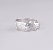 Moon is not among the most common crest figures but is frequently depicted in the art of the Northwest Coast. Often holding significant symbolism and depicted in varying forms, the Moon can represent a celestial force that carries both spiritual and practical associations. To some, Moon is associated with peace and transformation, but on occasion is regarded as a protector and guardian. Many nations associate Moon with a feminine aspect. The Nuu-chah-nulth, whose year is comprised of thirteen lunar years, view Moon as a masculine figure. There is also a Nuu-chah-nulth oral tradition that recounts that lunar eclipses occur when a giant, supernatural Codfish or Lingcod tries to swallow the Moon, thereby momentarily blocking the light. In Nuxálk culture, the Moon appears frequently in the Winter Ceremonies. Most often characterized by humanoid features, Moon can be distinguished from Sun by a lack of prominent rays, instead bearing a rim or halo of design around the circumference. In some instances, a labret in the Moon’s bottom lip indicates feminine associations.