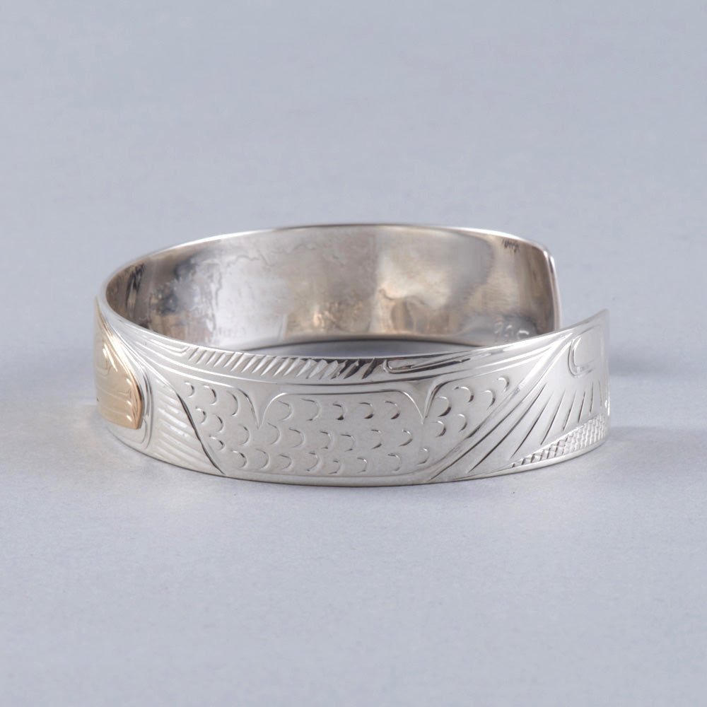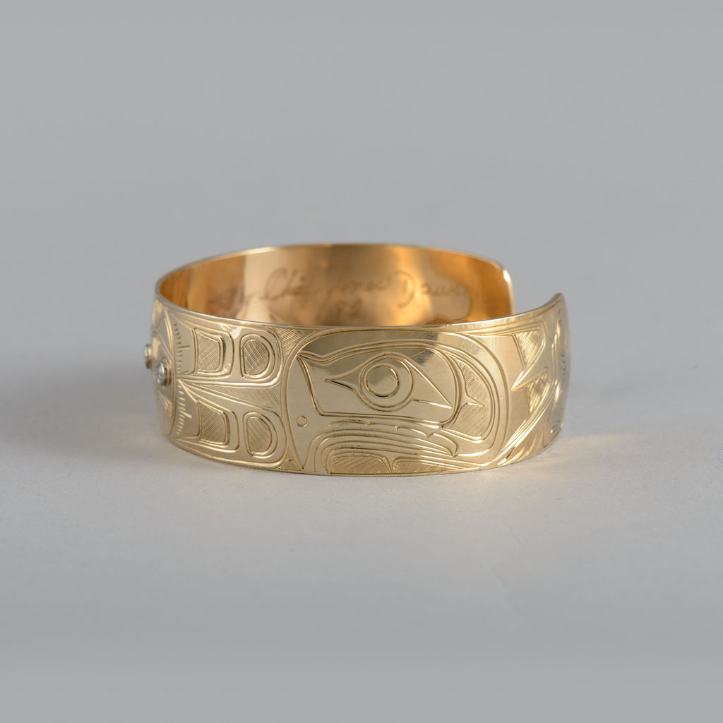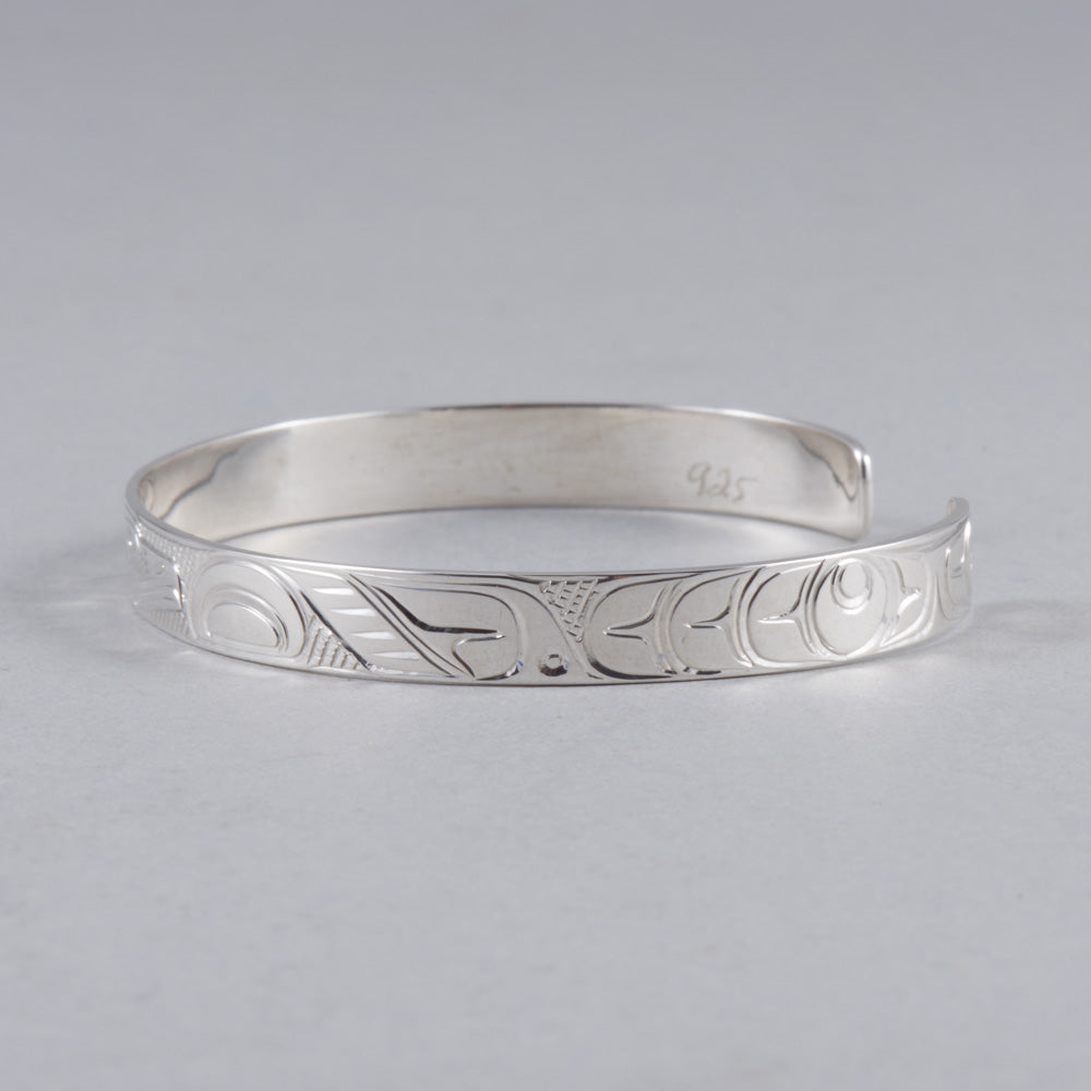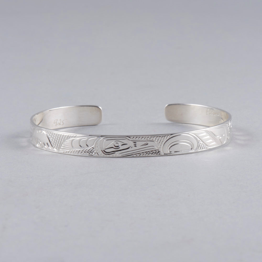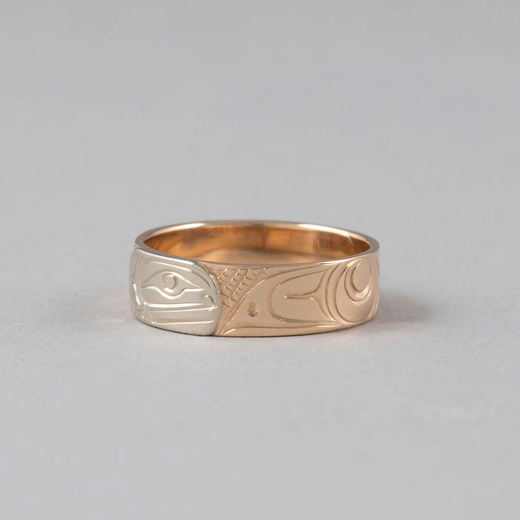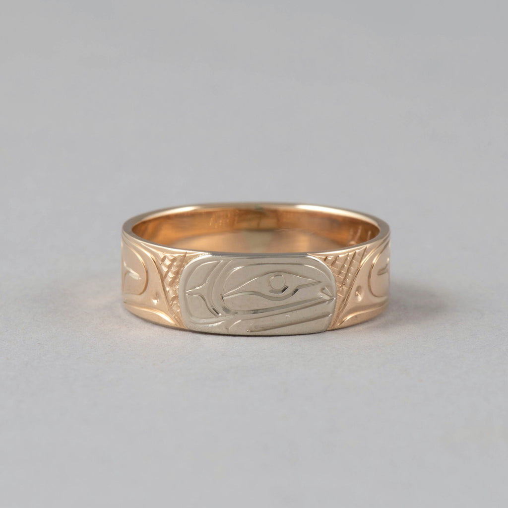 Rings are available to order in various sizes. Please contact the gallery directly. Indigenous artwork on the Pacific Northwest Coast often incorporates figures and animals that are related to crest symbols. Crests have been passed down through families and have varying meanings depending on the context and association with a nation, clan, or family. The figures depicted in contemporary Northwest Coast Indigenous artwork also have varying meanings but there are some common characteristics fro...