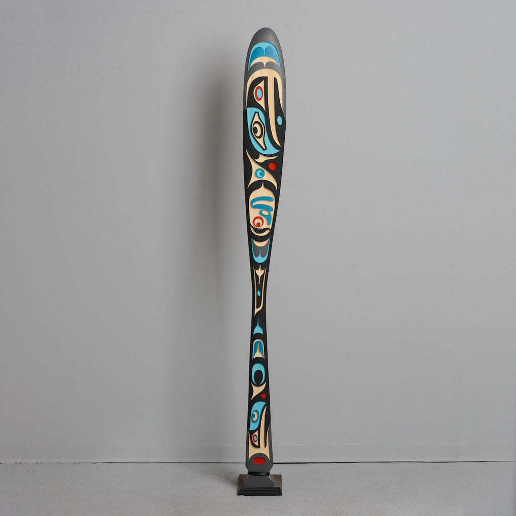 Paddle stand available for $300 CAD. Please allow 2 to 3 weeks for fabrication. Contact the gallery directly to order a stand. Indigenous artwork on the Pacific Northwest Coast often incorporates figures and animals that are related to crest symbols. Crests have been passed down through families and have varying meanings depending on the context and association with a nation, clan, or family. The figures depicted in contemporary Northwest Coast Indigenous artwork also have varying meanings bu...