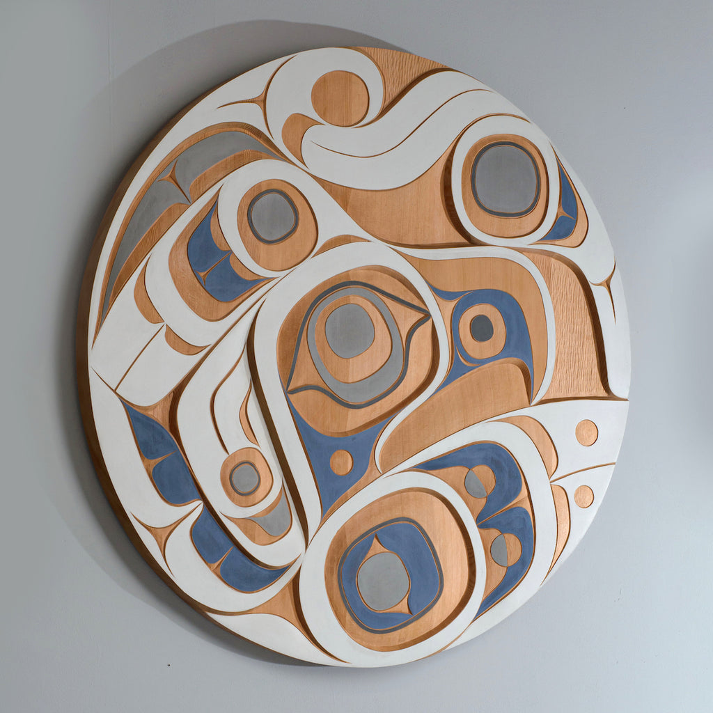 Drifted Ashore House is the name of a Tlingit clan from Tongass, Alaska and speaks to Klatle-bhi’s family lineage. It was a Tlingit woman from this clan that married a Kwakiutl man, and was lineage to the Hunt family of the Kwakwaka’wakw Nation; the lineage of Klatle-bhi’s family. The panel is a representation of the long history he has to the Tlingit people, and this clan in particular, with the two faces on the panel meant to represent the male and female ancestors and balance of that line....