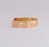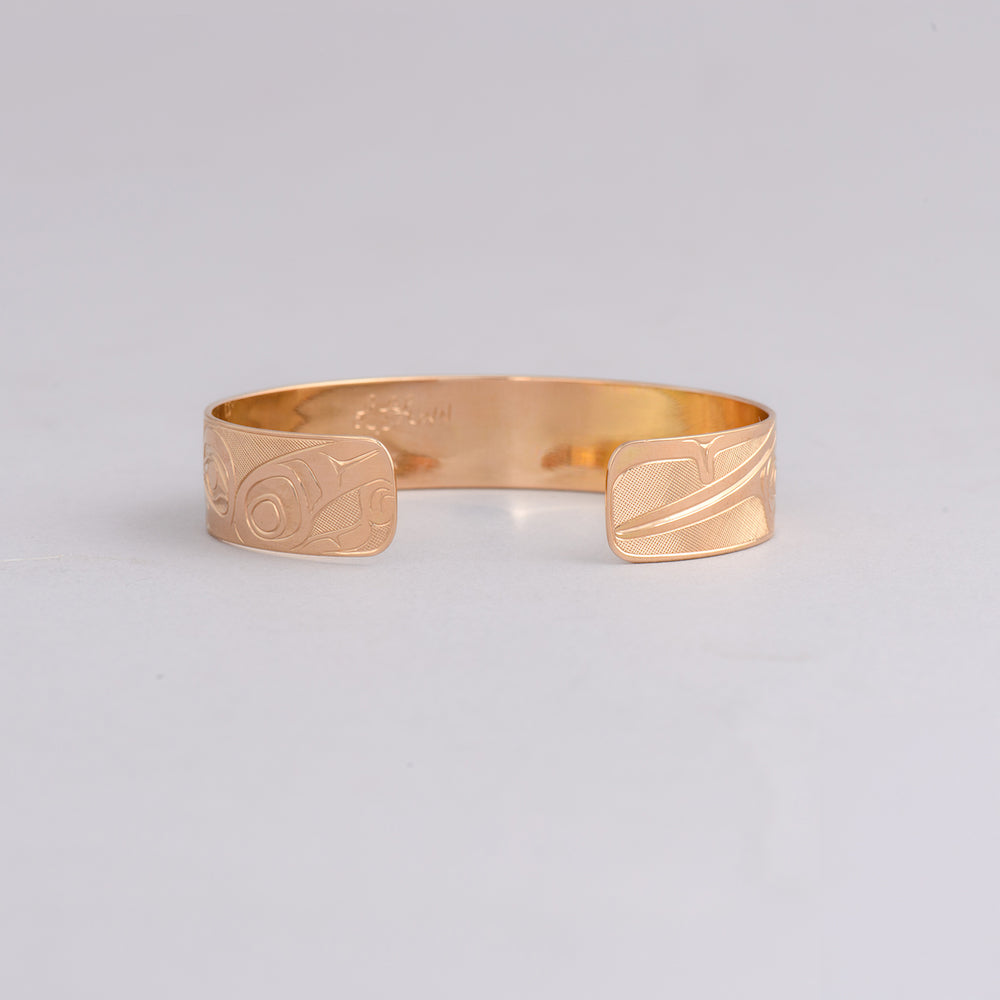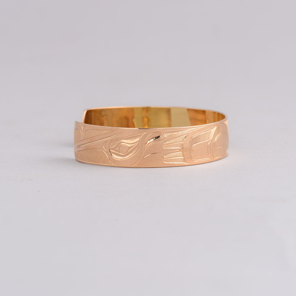 Hummingbird is a popular figure in Northwest Coast artwork, especially in jewelry. Generally, Hummingbird has associations with joy, beauty, and good luck. A legend from the Kwakwaka'wakw says that Dzunuk'wa (guardian of the mountains and Wild Woman of the Woods) loved this little bird so much that she let him nest in her hair. In return, the Hummingbird looked like jewelry pinned in her hair. Of all the birds, Hummingbird is the most talented flyer as it can hover in one place, fly sideways, backwards, and forwards. It is agile and adaptable, and some say can teach us how to move forward. Hummingbird is usually depicted with a small round head and a long beak with a sharp point. Flowers are often included in a design with Hummingbird.