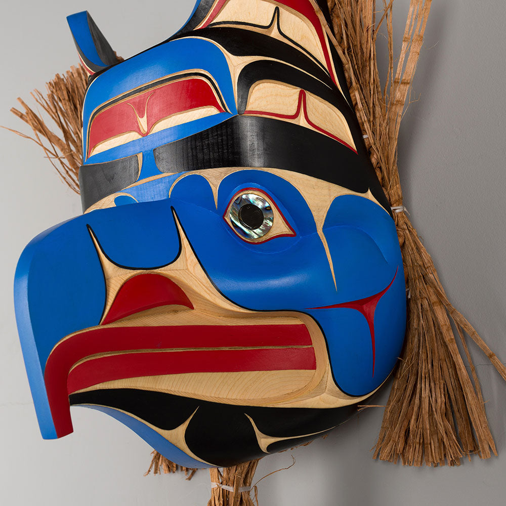Eagle is an especially prominent figure in artwork on the Northwest Coast. There is a large population of eagles along the coast of the Pacific Northwest. Eagle is one of two crests among the Haida and Tlingit, and one of the main crests among the Tsimshian and Heiltsuk. It is typically respected for extraordinary vision, in both the literal and figurative senses. Eagle is considered one of the most sacred figures as it has been said to carry the prayers of the people to the Creator and Eagles are frequently referenced in ceremonial contexts. Eagle feathers and down are customarily used in a variety of different ceremonies such as honouring a respected guest. In Northwest Coast artwork, Eagle is often depicted with a hooked beak and small ears.
