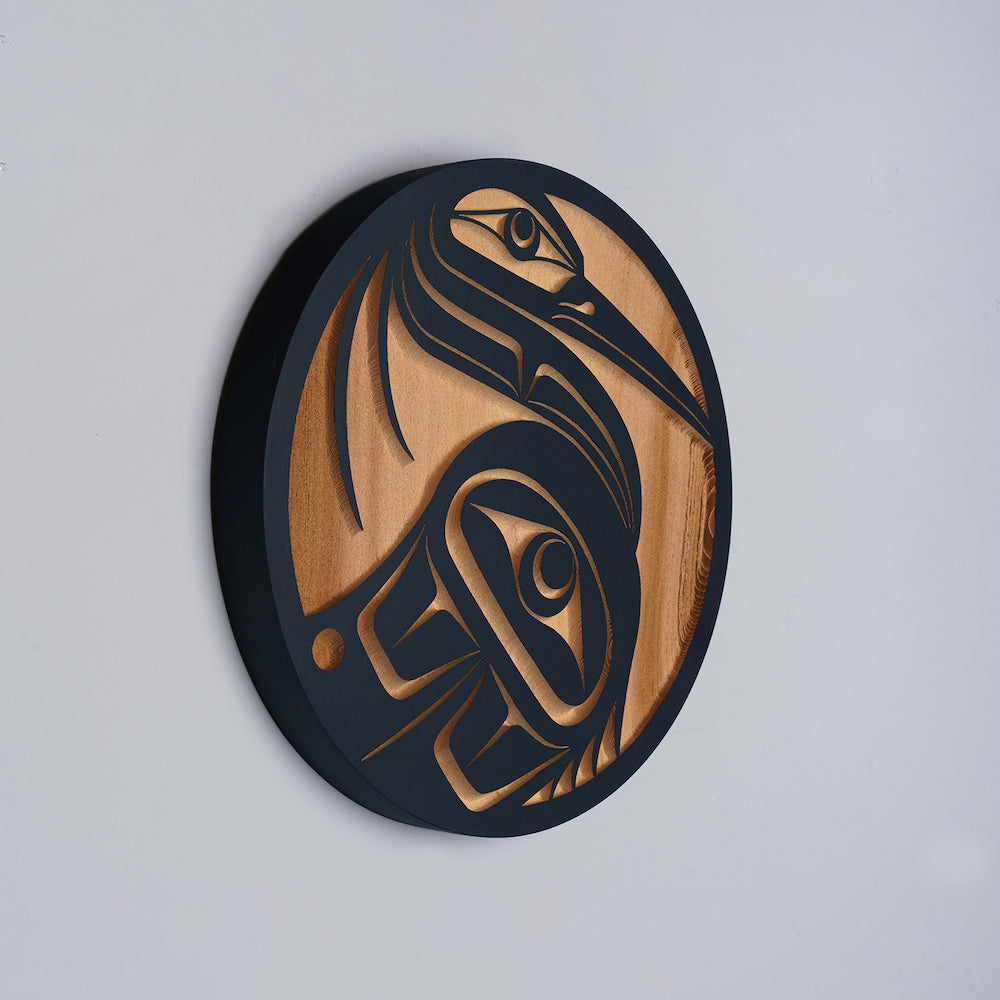 Indigenous artwork on the Pacific Northwest Coast often incorporates figures and animals that are related to crest symbols. Crests have been passed down through families and have varying meanings depending on the context and association with a nation, clan, or family. The figures depicted in contemporary Northwest Coast Indigenous artwork also have varying meanings but there are some common characteristics from a range of sources, including oral histories and artist descriptions. Raven is one...