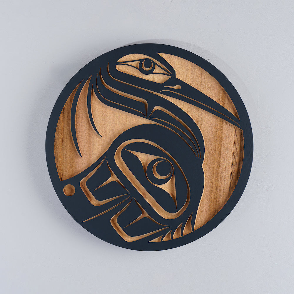 From Cheryl Shearar's "Understanding Northwest Coast Art": "The Kingfisher is a straight-billed, colourful, crested shorebird. People admire the bird’s fishing skills; it is patient, agile and quick. As a creature at home in various environments, the solitary and resourceful kingfisher is also useful as a spirit guide. Kingfisher depictions often feature a strong straight beak that is less fine and shorter than that of a Crane or Oystercatcher, and a short, strong tail. Kingfisher is commonl...