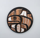Killer Whale is a common crest and being among many groups of the Northwest Coast, and one of the most prevalent depictions in the artwork. In some Haida oral traditions, Raven-Finned Killer Whale is a whale-chief and characterized by a Raven-headed dorsal fin. There are also Haida depictions of two-, three-, and even five-finned Killer Whales. It has been suggested that these supernatural figures may have originated from sightings of whale pods surfacing, with multiple dorsal fins visible above the water. Killer Whale’s familial bonds and skillfulness in teamwork can oftentimes lead to associations with communication, family, unity, and travel. Killer Whale is generally identified by a large ovoid eye, blowhole, dorsal fin, and tail flukes.