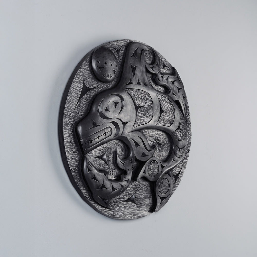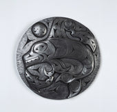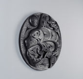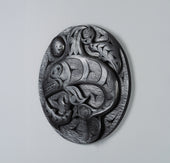 Killer Whale is a common crest and being among many groups of the Northwest Coast, and one of the most prevalent depictions in the artwork. In some Haida oral traditions, Raven-Finned Killer Whale is a whale-chief and characterized by a Raven-headed dorsal fin. There are also Haida depictions of two-, three-, and even five-finned Killer Whales. It has been suggested that these supernatural figures may have originated from sightings of whale pods surfacing, with multiple dorsal fins visible above the water. Killer Whale’s familial bonds and skillfulness in teamwork can oftentimes lead to associations with communication, family, unity, and travel. Killer Whale is generally identified by a large ovoid eye, blowhole, dorsal fin, and tail flukes.