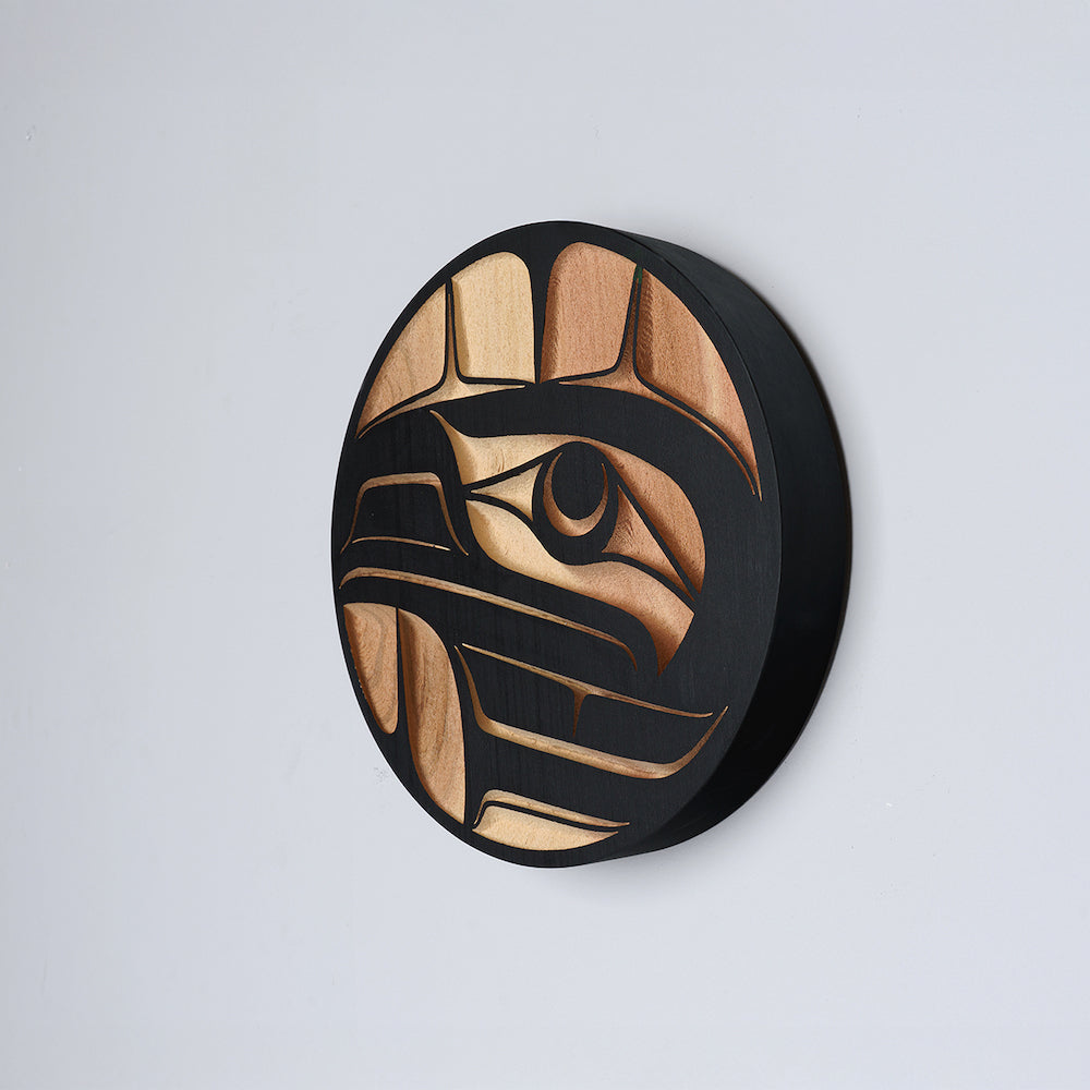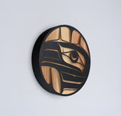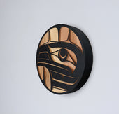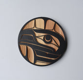Raven is one of the most recognized figures in Northwest Coast art and oral tradition. Viewed oftentimes as a transformer and a trickster, Raven is the hero of many adventures such as the release of light into the world and the discovery of mankind. As a trickster figure, Raven can be celebrated for his cleverness, wit, and mischievous nature. In some oral traditions, Raven possesses the ability to shape-shift and is often depicted with a sense of humor and playfulness. Raven is identified by a thick, straight beak and the lack of plumage or horns on the head. Oftentimes, Raven will be depicted with a ball of light in his beak.