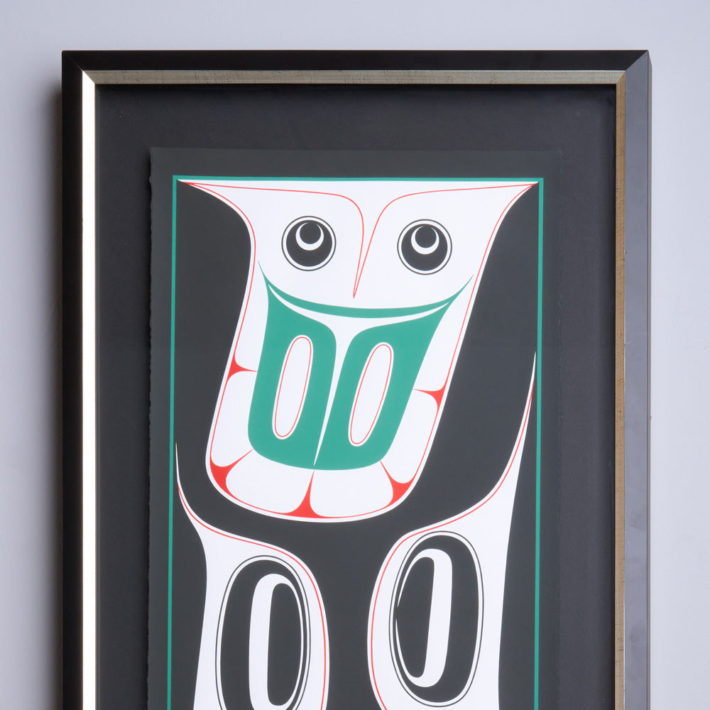 Edition /82 This print is available framed for $1,000 CAD. Please contact the gallery directly. Indigenous artwork on the Pacific Northwest Coast often incorporates figures and animals that are related to crest symbols. Crests have been passed down through families and have varying meanings depending on the context and association with a nation, clan, or family. The figures depicted in contemporary Northwest Coast Indigenous artwork also have varying meanings but there are some common charact...