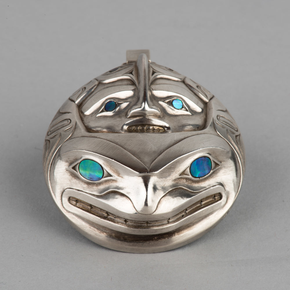 This work is the original gold casting from which six numbered gold castings and sixteen numbered silver casting were taken Exhibited: Vancouver Art Gallery, Eagle of the Dawn, 1993, travelling to the Canadian Museum of Civilization, Quebec, 1994 Indigenous artwork on the Pacific Northwest Coast often incorporates figures and animals that are related to crest symbols. Crests have been passed down through families and have varying meanings depending on the context and association with a nation...