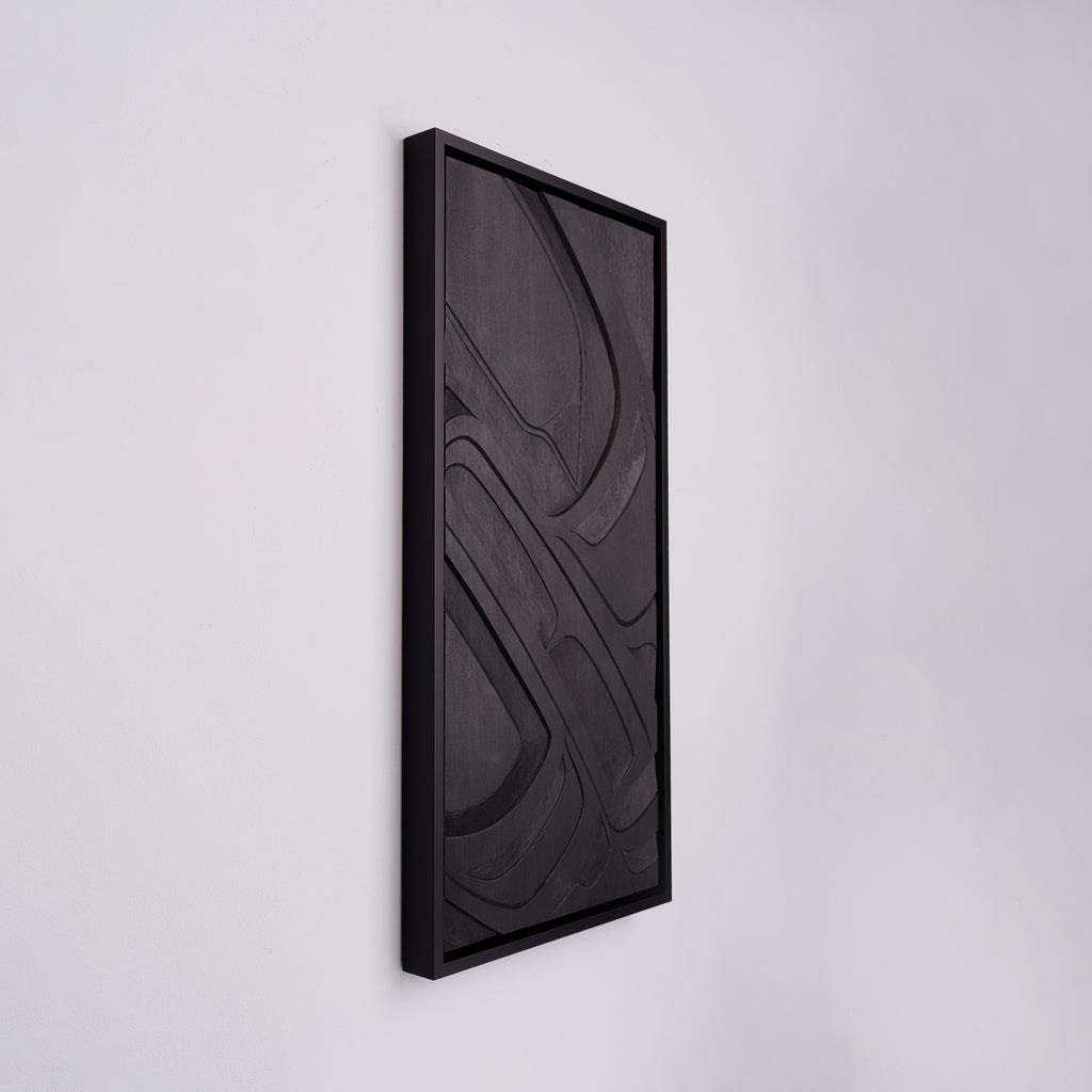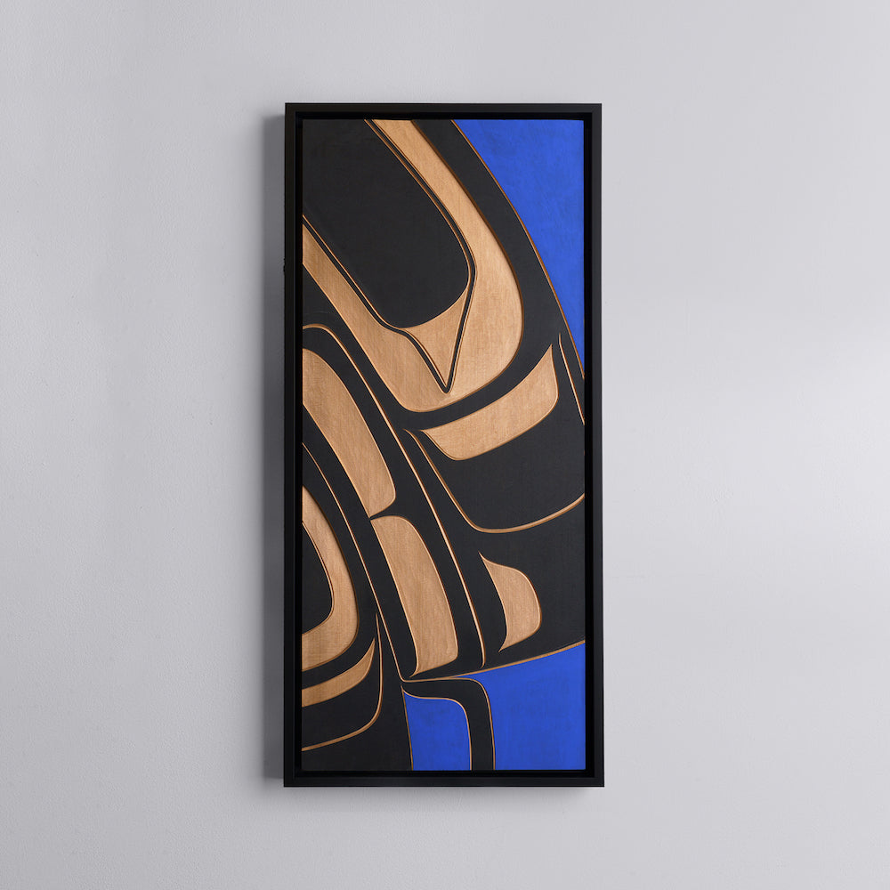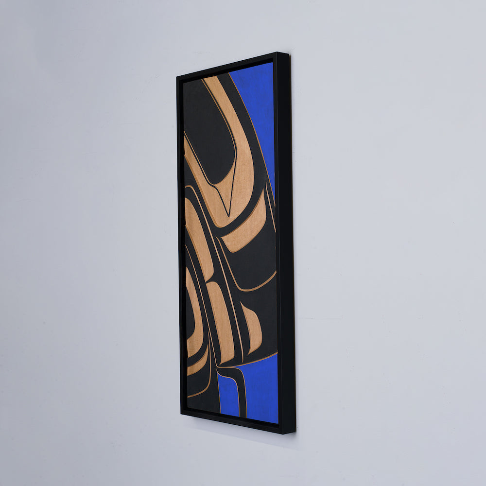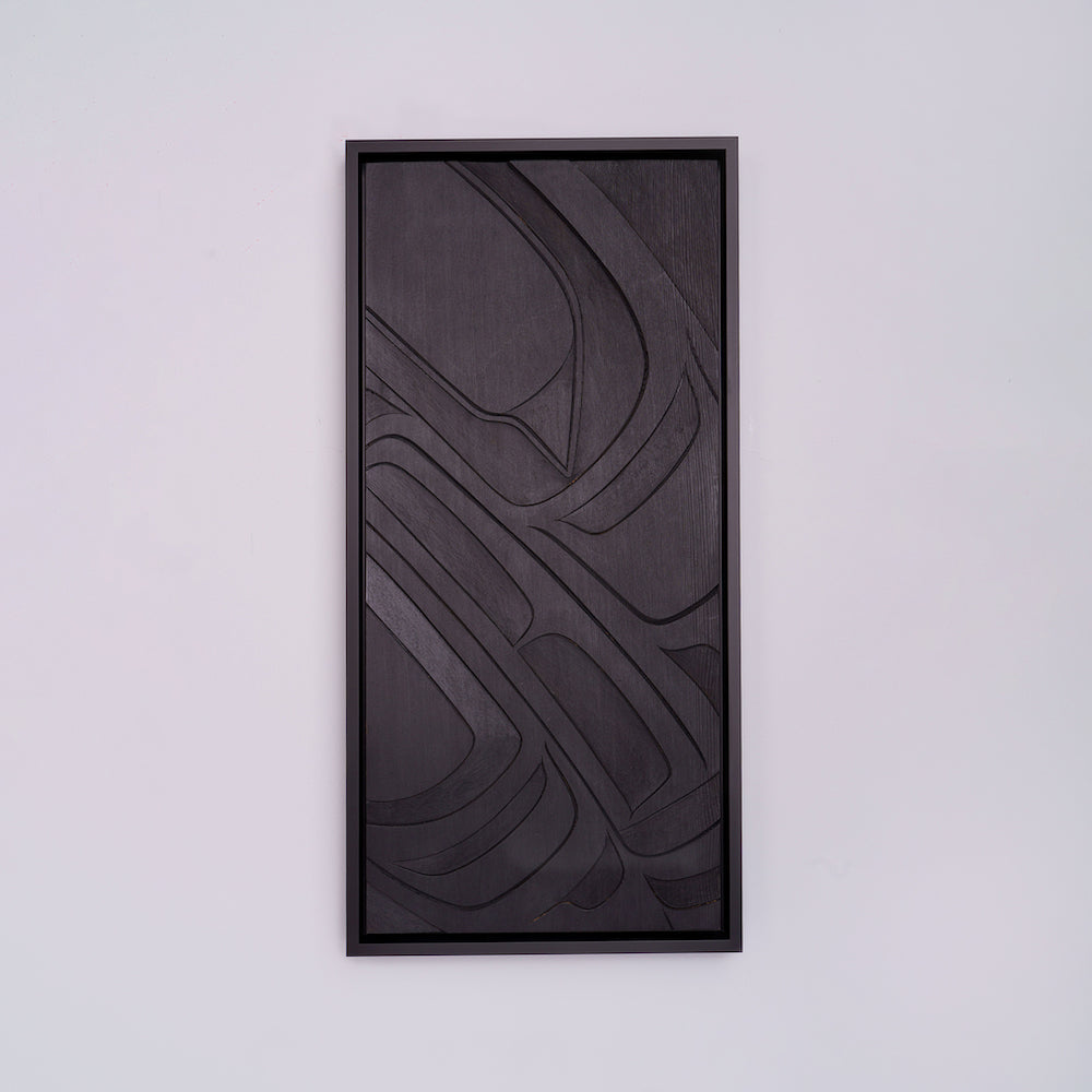 Angus creates his panel works in cedar wood, incorporating traditional K’san style and design. He is a practiced carver and his pieces are thoughtful, consistent, and deeply etched. He now lives and carves full time in Vancouver.