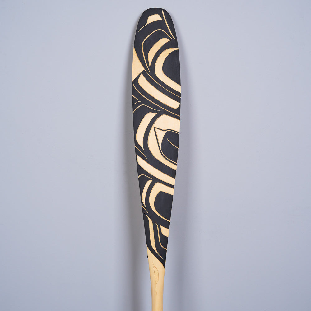 Paddle stand available for $300 CAD. Please allow 2 to 3 weeks for fabrication. Contact the gallery directly to order a stand. Indigenous artwork on the Pacific Northwest Coast often incorporates figures and animals that are related to crest symbols. Crests have been passed down through families and have varying meanings depending on the context and association with a nation, clan, or family. The figures depicted in contemporary Northwest Coast Indigenous artwork also have varying meanings bu...