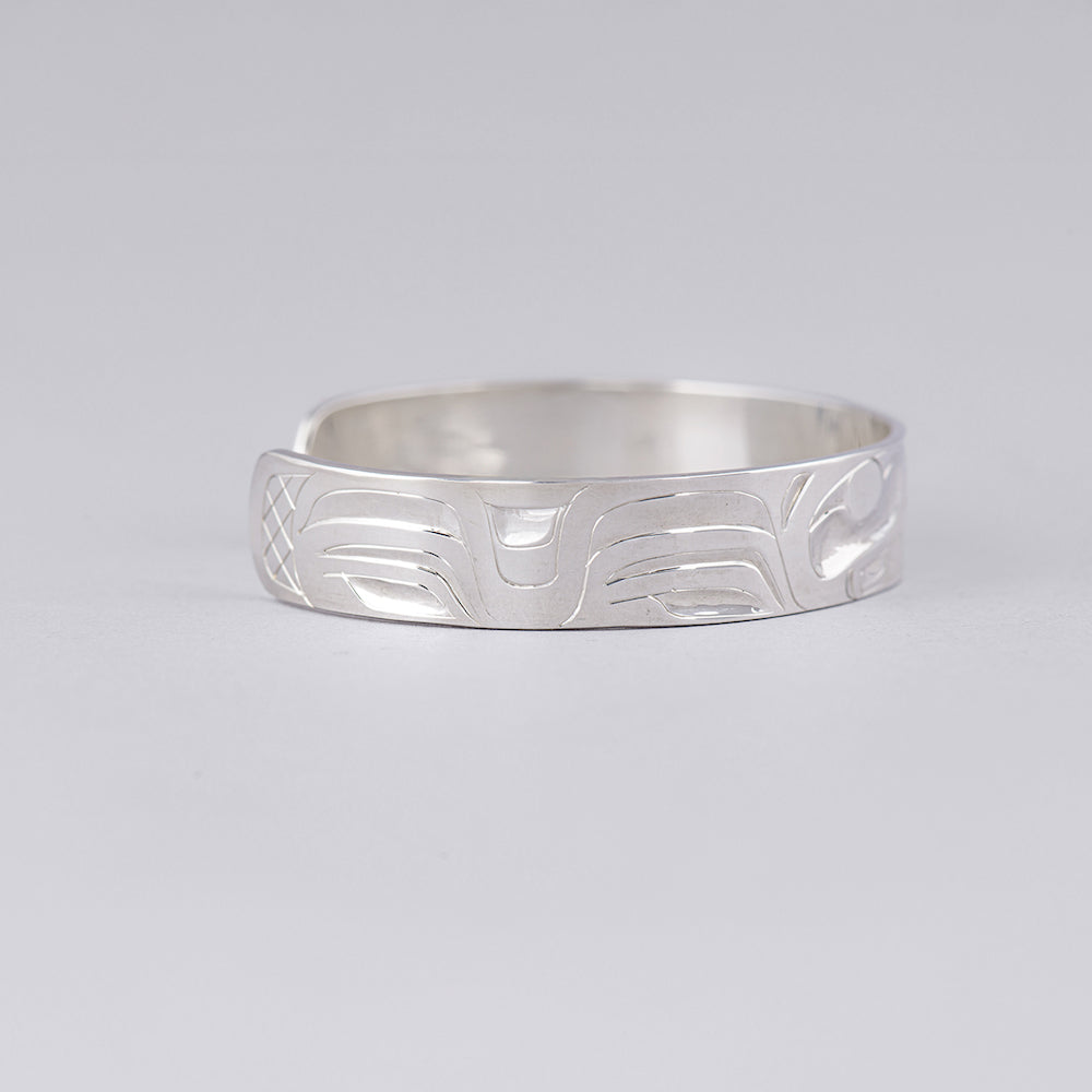 Beaver appears in Northwest Coast art and is a crest figure in many regions. In oral traditions, Beaver is said to keep to itself and cares little for the activities of humans. In one such tradition, the first ancestral Beaver was a woman who spent her time waiting for her husband swimming, eventually turning into a Beaver. In another tradition, Beaver is one of Raven’s uncles, with Raven borrowing many treasures from him. Wise and reserved, some say it is best to listen when Beaver speaks. Beaver can be recognized by a Bear-like head, rounded snout, short ears, and prominent incisor teeth. Beaver is often shown holding a piece of wood with a scaled tail flipped up in front of the body.