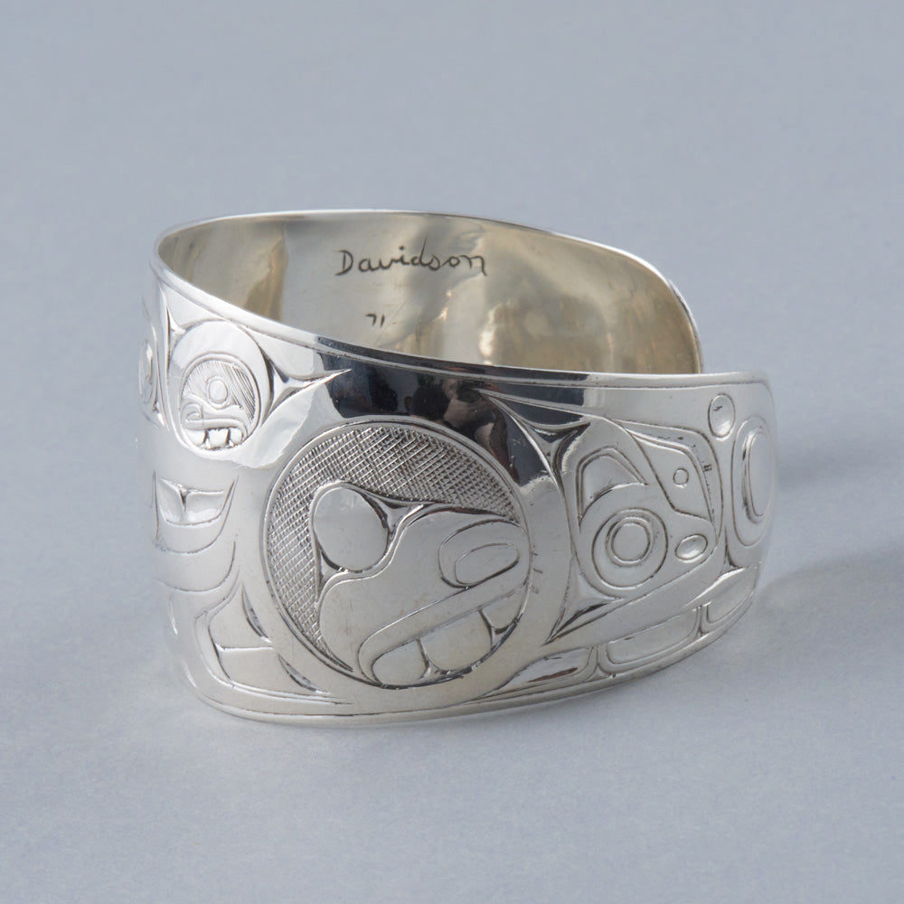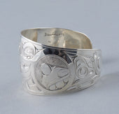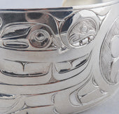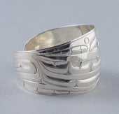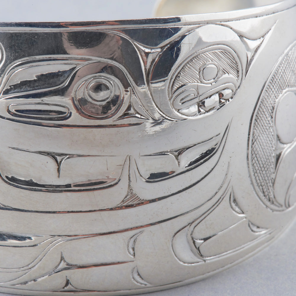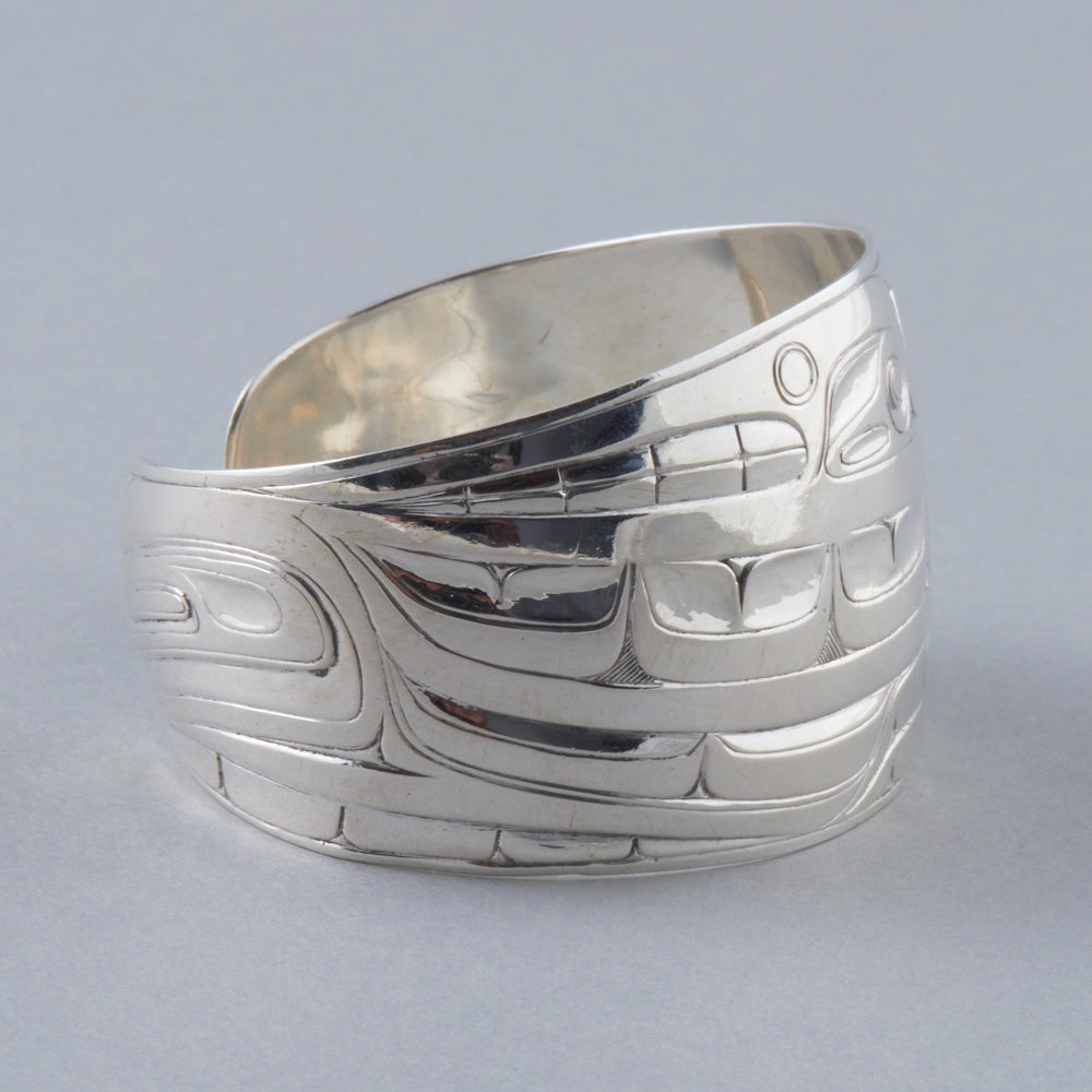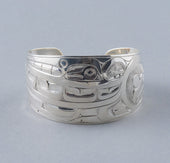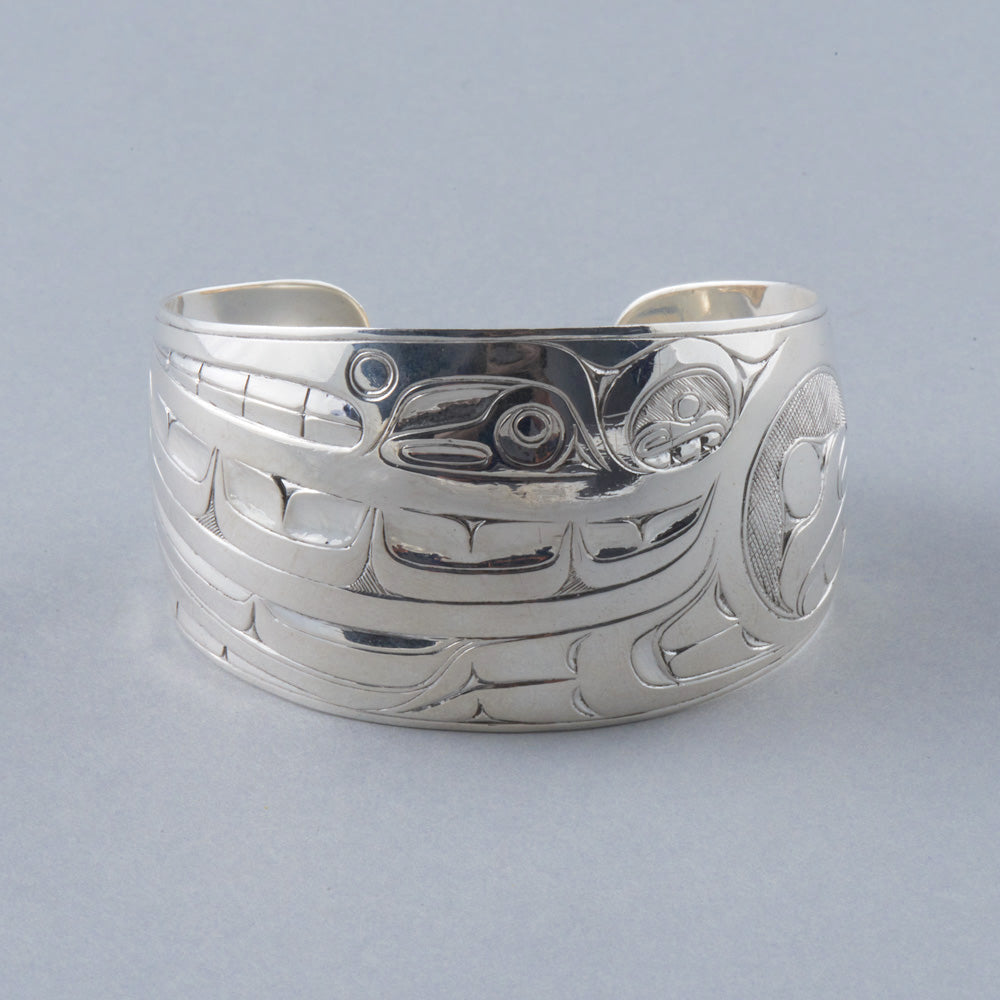 Killer Whale is a common crest and being among many groups of the Northwest Coast, and one of the most prevalent depictions in the artwork. In some Haida oral traditions, Raven-Finned Killer Whale is a whale-chief and characterized by a Raven-headed dorsal fin. There are also Haida depictions of two-, three-, and even five-finned Killer Whales. It has been suggested that these supernatural figures may have originated from sightings of whale pods surfacing, with multiple dorsal fins visible above the water. Killer Whale’s familial bonds and skillfulness in teamwork can oftentimes lead to associations with communication, family, unity, and travel. Killer Whale is generally identified by a large ovoid eye, blowhole, dorsal fin, and tail flukes.