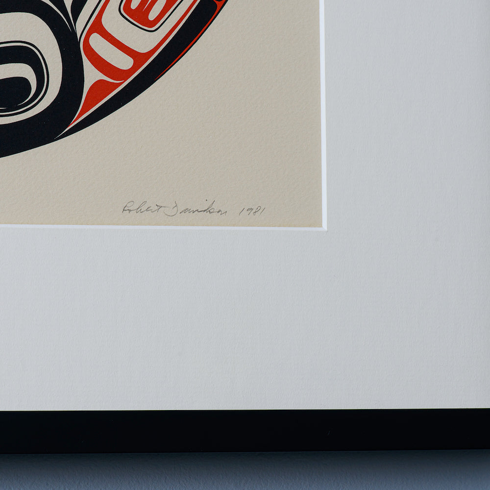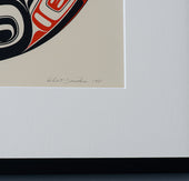 A minor crest figure (among certain Kwakwaka’wakw clans, for example), Butterfly is an increasingly prevalent figure in contemporary Northwest Coast art. In one Haida oral tradition from Masset, Butterfly is Raven’s travelling companion and spokesman, also acting as a scout who leads Raven to food sources and uncovers hiding spots. To some, the remarkable life cycle of the Butterfly can represent change, renewal, and rebirth. Butterfly is usually identified by a curling proboscis, rounded wings, and often accompanied by a floral motif.
