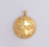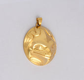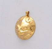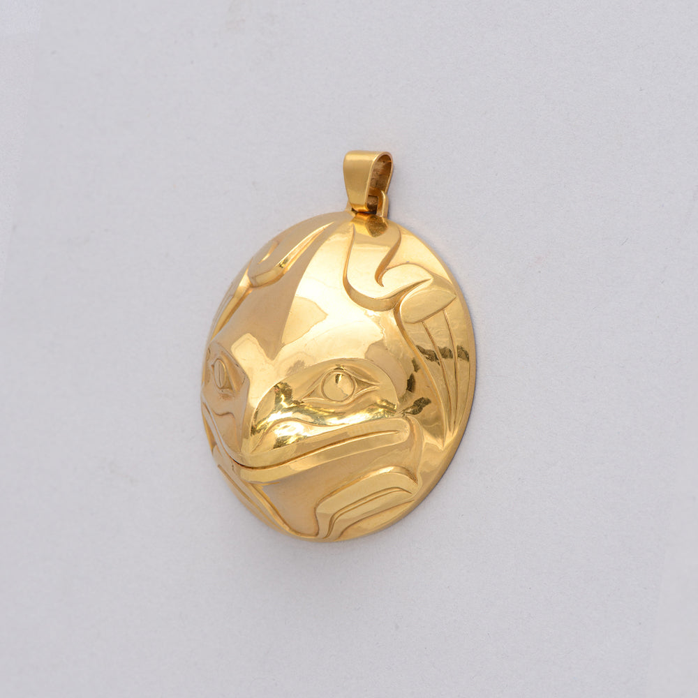 Frog is a creature of great importance on the Northwest Coast. Frogs are social and vocal creatures and are typically seen as the communicators of the animal world. They often symbolize communication and represent the voice of the people. Frog is also associated with versatility as it lives in both water and land. In Northwest Coast artwork, Frog is sometimes depicted with its tongue going into the mouth of another figure as a visual reference for sharing knowledge. Frog is generally given large eyes, prominent lips with a projecting tongue and webbed feet.