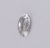 Hummingbird is a popular figure in Northwest Coast artwork, especially in jewelry. Generally, Hummingbird has associations with joy, beauty, and good luck. A legend from the Kwakwaka'wakw says that Dzunuk'wa (guardian of the mountains and Wild Woman of the Woods) loved this little bird so much that she let him nest in her hair. In return, the Hummingbird looked like jewelry pinned in her hair. Of all the birds, Hummingbird is the most talented flyer as it can hover in one place, fly sideways, backwards, and forwards. It is agile and adaptable, and some say can teach us how to move forward. Hummingbird is usually depicted with a small round head and a long beak with a sharp point. Flowers are often included in a design with Hummingbird.