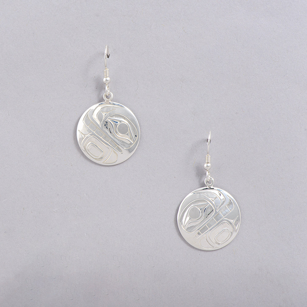 Killer Whale is a common crest and being among many groups of the Northwest Coast, and one of the most prevalent depictions in the artwork. In some Haida oral traditions, Raven-Finned Killer Whale is a whale-chief and characterized by a Raven-headed dorsal fin. There are also Haida depictions of two-, three-, and even five-finned Killer Whales. It has been suggested that these supernatural figures may have originated from sightings of whale pods surfacing, with multiple dorsal fins visible above the water. Killer Whale’s familial bonds and skillfulness in teamwork can oftentimes lead to associations with communication, family, unity, and travel. Killer Whale is generally identified by a large ovoid eye, blowhole, dorsal fin, and tail flukes.