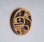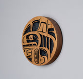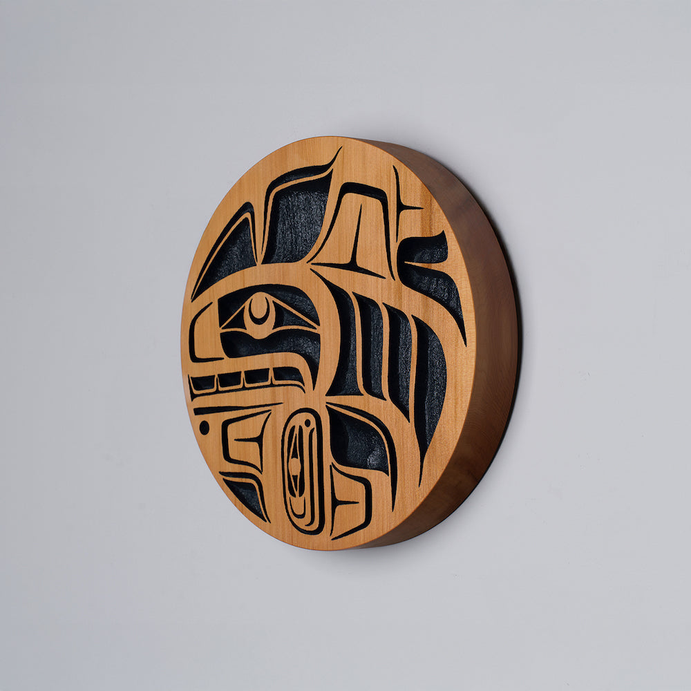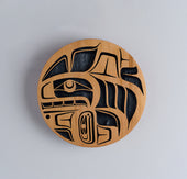 Killer Whale is a common crest and being among many groups of the Northwest Coast, and one of the most prevalent depictions in the artwork. In some Haida oral traditions, Raven-Finned Killer Whale is a whale-chief and characterized by a Raven-headed dorsal fin. There are also Haida depictions of two-, three-, and even five-finned Killer Whales. It has been suggested that these supernatural figures may have originated from sightings of whale pods surfacing, with multiple dorsal fins visible above the water. Killer Whale’s familial bonds and skillfulness in teamwork can oftentimes lead to associations with communication, family, unity, and travel. Killer Whale is generally identified by a large ovoid eye, blowhole, dorsal fin, and tail flukes.