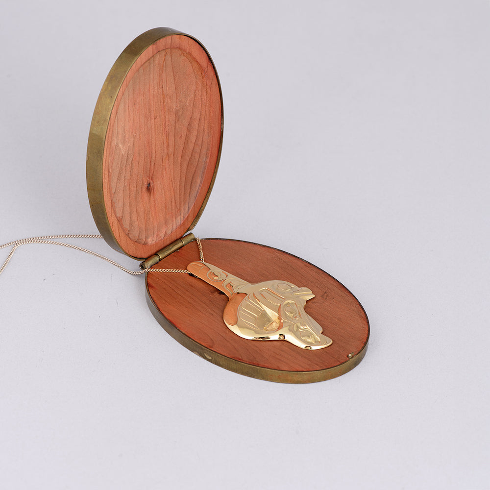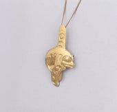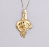 Killer Whale is a common crest and being among many groups of the Northwest Coast, and one of the most prevalent depictions in the artwork. In some Haida oral traditions, Raven-Finned Killer Whale is a whale-chief and characterized by a Raven-headed dorsal fin. There are also Haida depictions of two-, three-, and even five-finned Killer Whales. It has been suggested that these supernatural figures may have originated from sightings of whale pods surfacing, with multiple dorsal fins visible above the water. Killer Whale’s familial bonds and skillfulness in teamwork can oftentimes lead to associations with communication, family, unity, and travel. Killer Whale is generally identified by a large ovoid eye, blowhole, dorsal fin, and tail flukes.