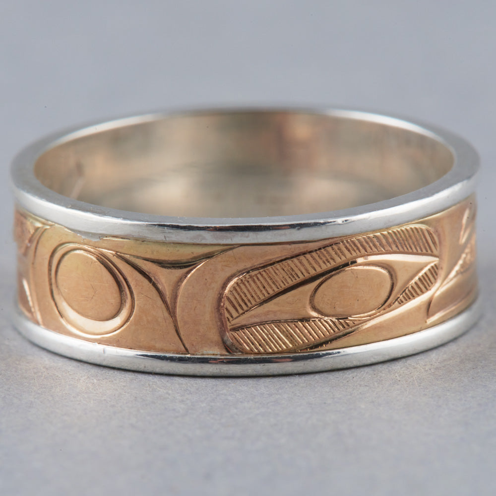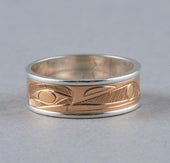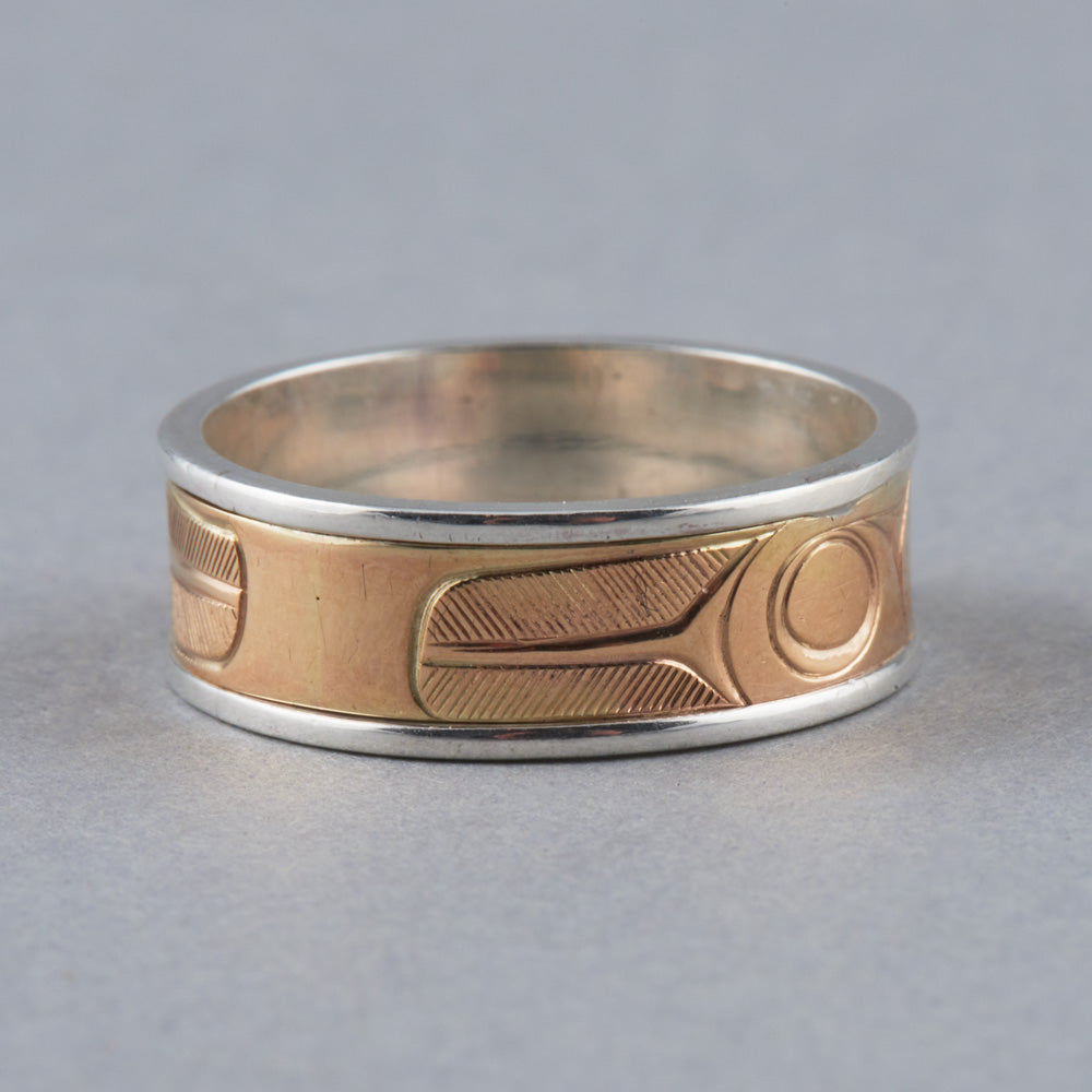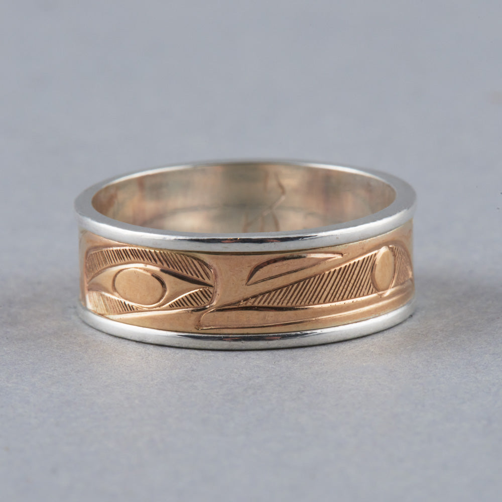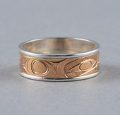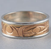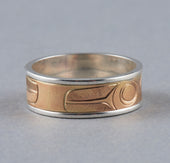 Raven is one of the most recognized figures in Northwest Coast art and oral tradition. Viewed oftentimes as a transformer and a trickster, Raven is the hero of many adventures such as the release of light into the world and the discovery of mankind. As a trickster figure, Raven can be celebrated for his cleverness, wit, and mischievous nature. In some oral traditions, Raven possesses the ability to shape-shift and is often depicted with a sense of humor and playfulness. Raven is identified by a thick, straight beak and the lack of plumage or horns on the head. Oftentimes, Raven will be depicted with a ball of light in his beak.