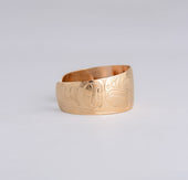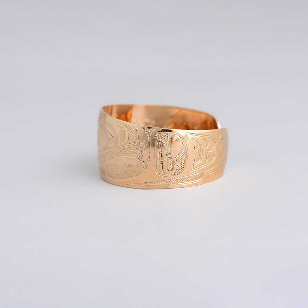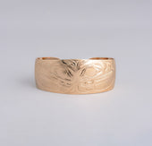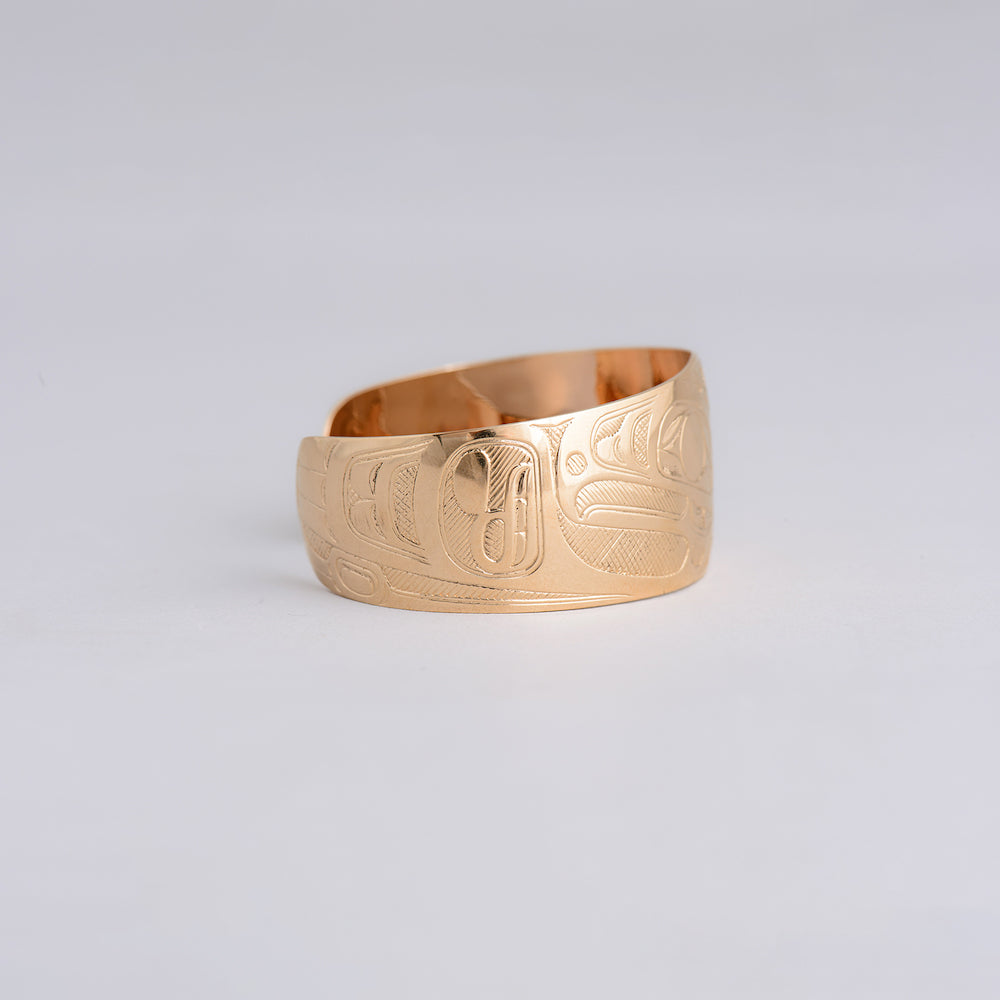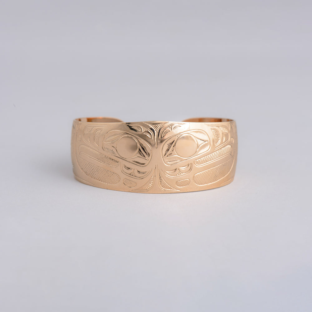 Thunderbird is not a primary crest figure amongst Northern Nations, instead being associated with Southern nations like the Nuu-chah-nulth, Salish, and Kwakwaka’wakw. Some oral traditions suggest that Thunderbird preys on Killer Whales and lives in the peaks of the coastal mountains. Others recount that this supernatural figure creates the boom of thunder as he flaps his wings in flight and is said to shoot lightning snakes from his eyes. It is sometimes suggested to epitomize power and strength. Not to be confused with Eagle, Thunderbird is identified by an exaggerated crooked beak and prominent horns. Sometimes artists will depict Thunderbird with teeth, lightning motifs, or alongside Killer Whale.